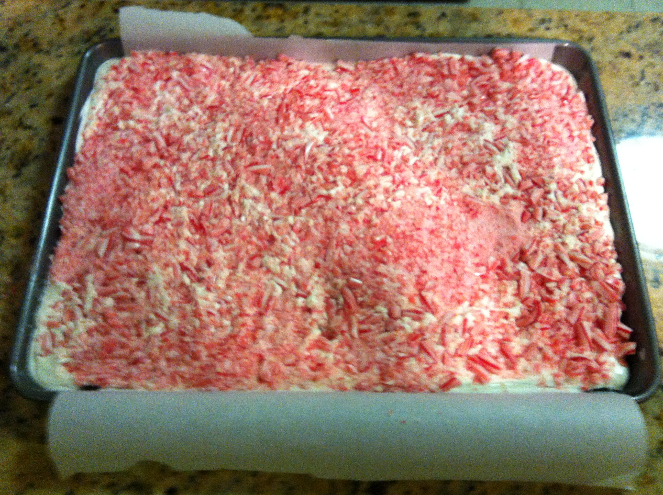 5. Working quickly so the white chocolate is still wet, evenly sprinkle the crushed candy canes all over the top surface of the white chocolate. Cover and place in the fridge until hardened, about 15+ minutes.