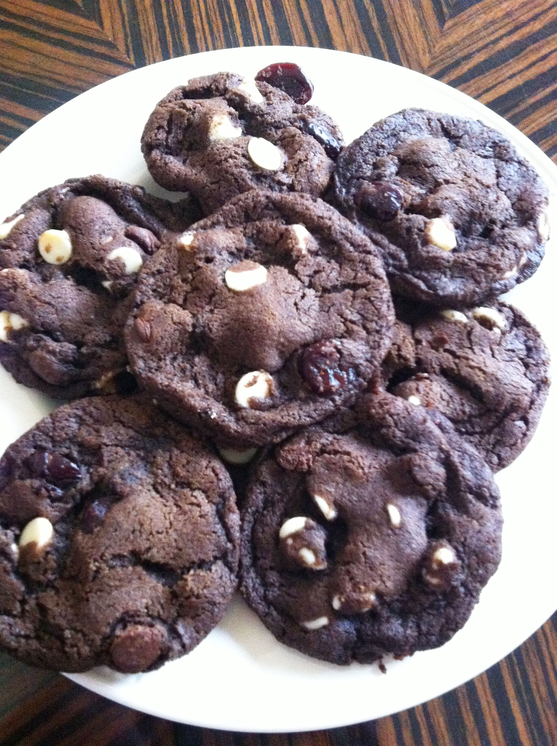 3. In a separate mixing bowl, combine the flour, cocoa, baking soda and salt. Gently fold into the butter/sugar mixture until fully incorporated. Fold in the chocolate chips, white chocolate chips, and dried cherries.